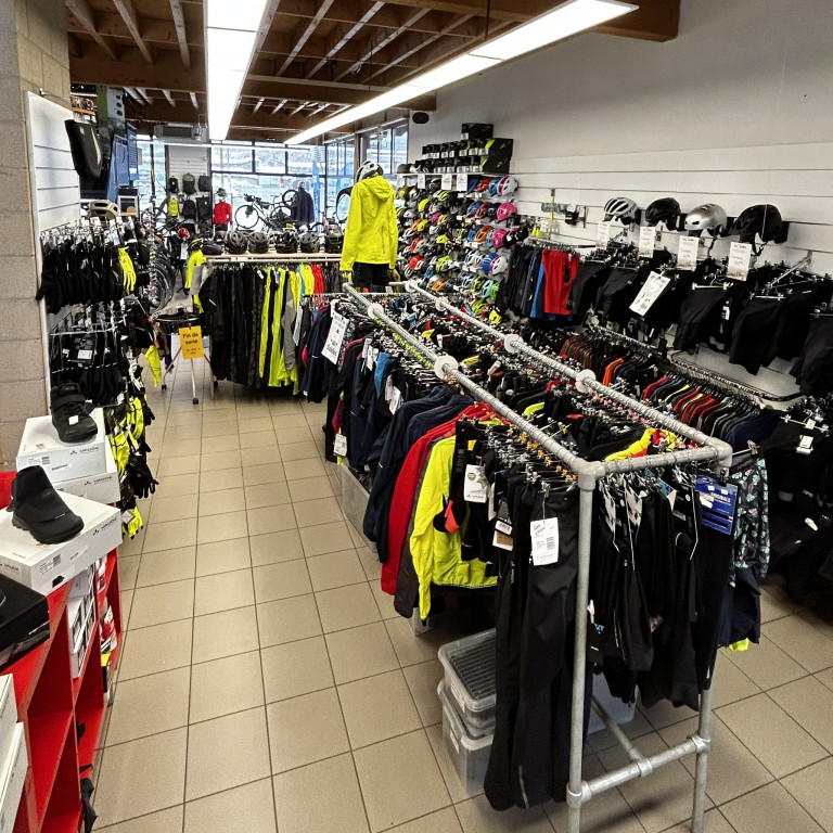 Vous trouvrerez tout ce qu'il vous faut pour vous équiper, de la tête aux pieds : chaussures avec système BOA, cales, shorts cyclistes, vestes étanches, casques, gants...